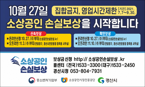 온라인 신청은 27일부터 손실보상 누리집(소상공인손실보상.kr)에서 할 수 있다. 방문 신청은 11월 3일부터 전담 창구(경산시민운동장 증축동 사무실)에서 할 수 있다. 자세한 사항은 소상공인 손실보상 콜센터[(중소기업벤처부)1533-3300, (대구경북중소벤처기업청-대구경북민원전담센터)1533-2450, (경산)053-804-7931]에서 안내받을 수 있다.