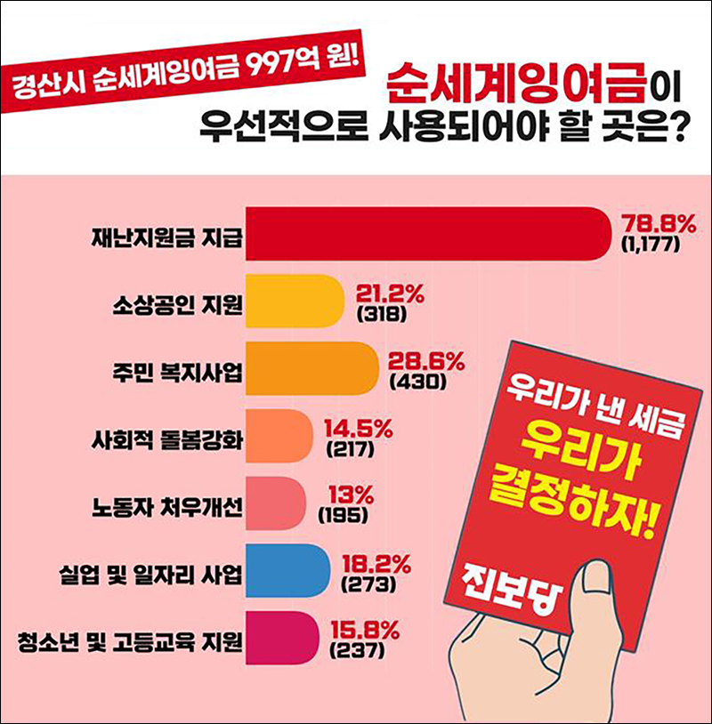 진보당 경산시위원회 지난 두 달간 진행된 순세계잉여금 주민설문의 결과를 발표하고 주민들의 요구인 전주민재난지원금 지급을 촉구했다.