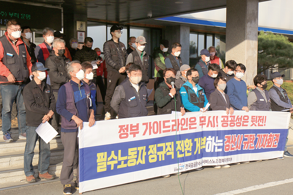 또 “지난 2017년 정부는 공공부문이 앞장서서 사회 양극화를 해소하고 공공서비스의 질을 제고하기 위해 공공부문 비정규직 근로자 정규직 가이드라인을 발표했다”며 “그러나 경산시는 이러한 사회적 합의와 시대정신을 비웃기라도 하듯 환경미화원과 수도검침원의 정규직 전환을 불성실한 태도로 일관해 왔다”고 규탄했다.