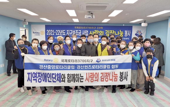 경산중앙로타리(회장 김성진)와 퀸즈로타리(회장 박선옥) 등 국제로타리 3700지구 2지역 소속 로타리안 들은 지난 20일 진량읍 선화리 지엠빌딩에서 김장 150박스를 담궈 지역 장애인단체에 전달했다.