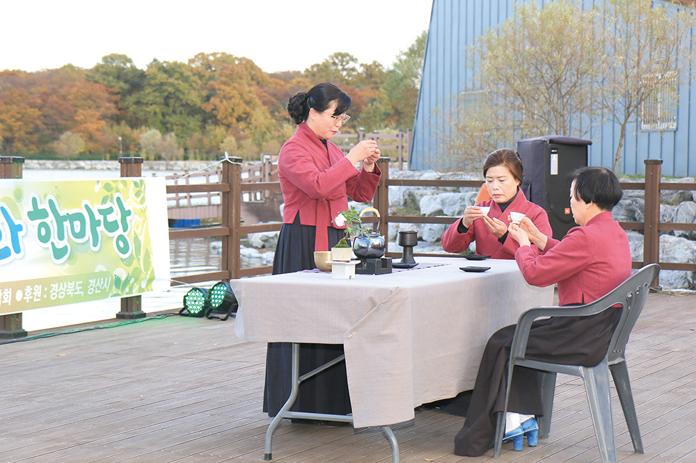 경산시차인연합회(회장 최순화(려원정다례원 원장)가 깊어가는 가을, 남매공원에서 네 번째 다례시연 및 우리차 문화 한마당 행사를 가졌다.