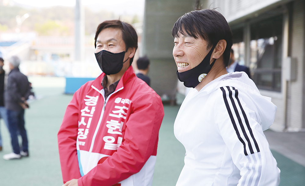 국민의힘 조현일 경산시장 예비후보가 지난 9일 오후 2시 경산시민운동장에서 친선경기를 위해 경산시를 찾은 신태용 감독을 만났다.