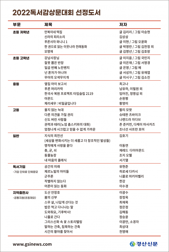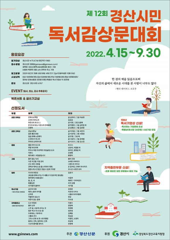 한편 경산시민 독서감상문대회는 경산신문 주관, 경산시와 경상북도경산교육지원청 후원으로 12회를 맞이했으며, 매년 경산시민들의 활발한 참여로 이어지고 있다.