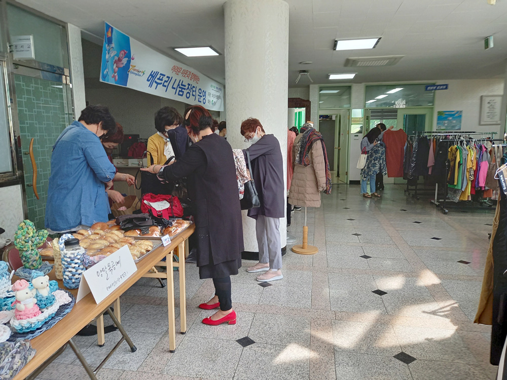 이날 나눔장터에는 여성자원활동센터 봉사 회원들과 여성회관 평생교육 수강생들이 직접 만든 만능 조림간장, 육개장, 물김치, 단팥빵 등과 그동안 기증받은 의류, 신발, 그림책 등 다양한 물품을 판매하여 고객들로부터 큰 호응을 얻었다.