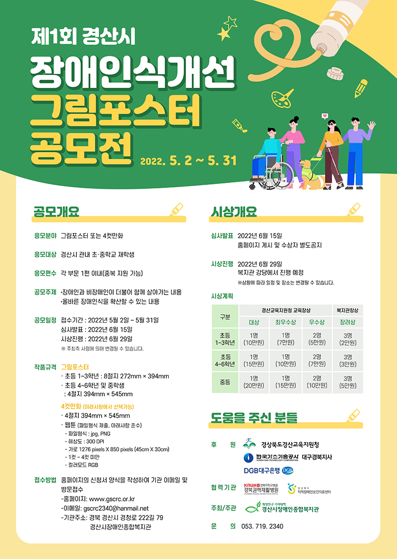 이번 공모전은 장애인식개선의 내용을 담은 순수창작 그림공모전(웹툰포함)으로 경산시에 거주하고 있는 초등학교(1학년~3학년, 4학년~6학년), 중학교 등으로 나누어 접수받을 예정이다.