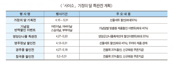 사이소에서는 5월 말까지 제철과일, 건강식품 등의 선물세트를 최대 50% 할인 판매하는 기획전을 마련하였고, 어린이날, 어버이날, 스승의 날, 부부의 날 등 기념일에 맞춰 기념일별 맞춤형 제품 반짝 할인 이벤트도 실시할 예정이다.