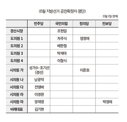 △경산시장 선거에는 국민의힘 조현일 예비후보가 단수공천됐다. 민주당은 2일 현재 후보를 내지 못하고 있다.