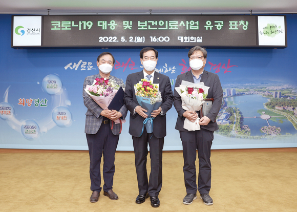 | ↑↑ 최영조 경산시장(가운데)와 이명갑 진료과장(오른쪽). |
