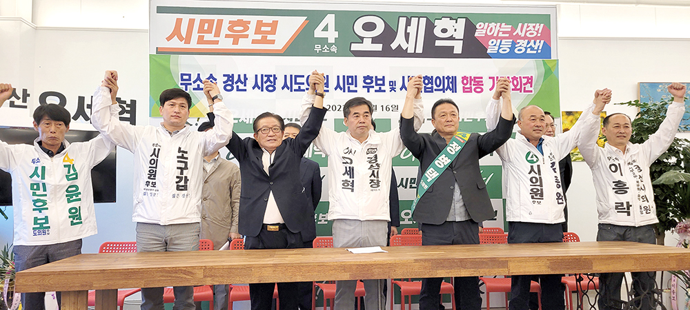경산시장 예비후보 당시 여론조사에서 1위를 기록했던 무소속 오세혁 후보는 “시민협의체는 경산을 분열시키고 화합을 가로막는 지역 국회의원 퇴출을 위해 향후 지속적인 시민운동으로 확대해 나갈 것”이라며 “무소속 시민후보의 승리는 곧 경산시민 승리이며 불공정을 뿌리 뽑고 공정과 상식을 되찾는 길임을 이 자리에서 분명히 한다”고 말했다.