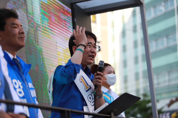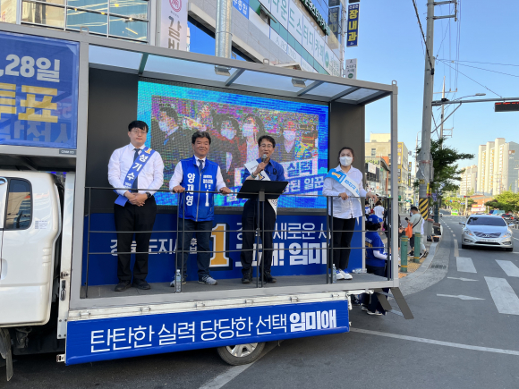 이원욱 과학기술정보방송통신위원장이 지난 27일 오후 경북 경산을 방문해 자신이 후원하는 더불어민주당 양재영(경산시 마 선거구) 기초의원후보 지원유세를 펼쳤다. 이날 유세에는 성기수(가 선거구) 기초의원후보와 김기현 비례기초의원후보도 함께했다.