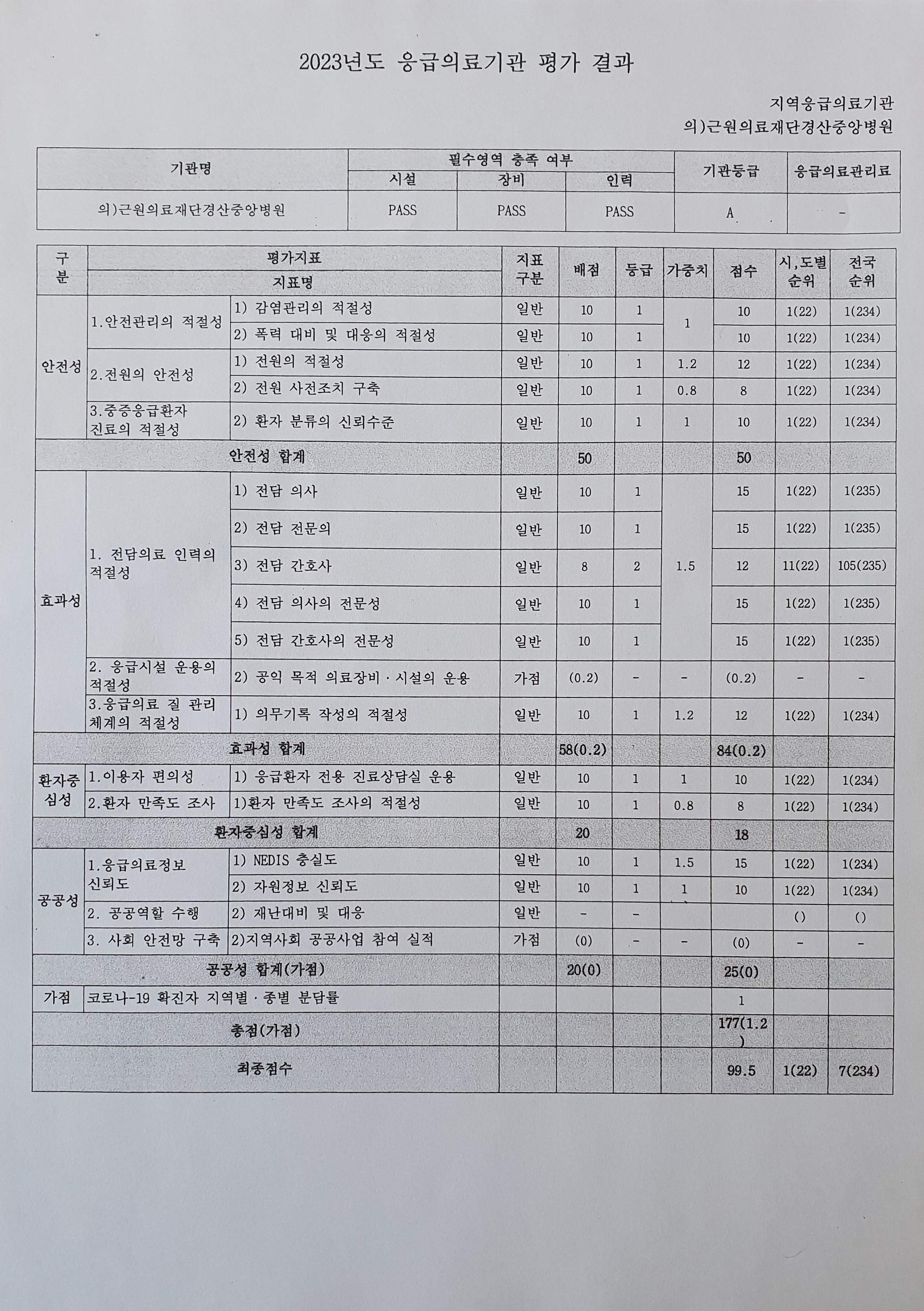 의료법인 근원의료재단 경산중앙병원(이사장 정민혜)이 보건복지부가 주관하고 국립중앙의료원에서 실시하는 ‘2023년 응급의료기관평가’에서 최고 등급인 A등급을 획득했다. 이것은 경북1위, 전국 7위에 해당한다.
