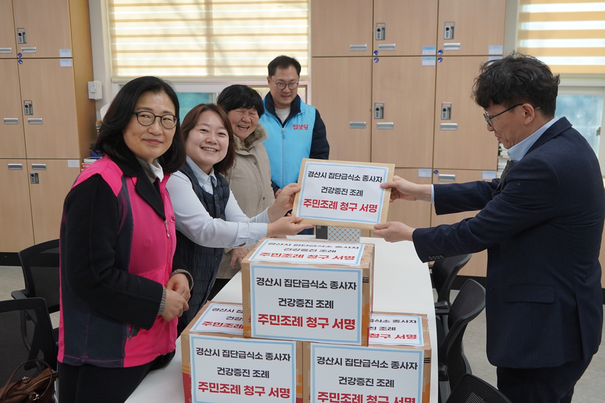 경산 주민대회 조직위원회(공동대표 남수정, 최광용, 박정애, 정진구)와 전국학교비정규직노동조합 경산지회(대표 조난희)가 지난 27일 시청 본관 앞에서 ‘경산시 집단급식소 종사자 건강증진 조례’ 주민 서명 제출 기자회견을 가진 후 경산시의회에 주민 서명을 제출했다.