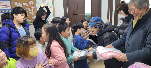 | ↑↑ 중방성당 사회복지위원회에서 아이들에게 가방을 전달하고 있다. |
