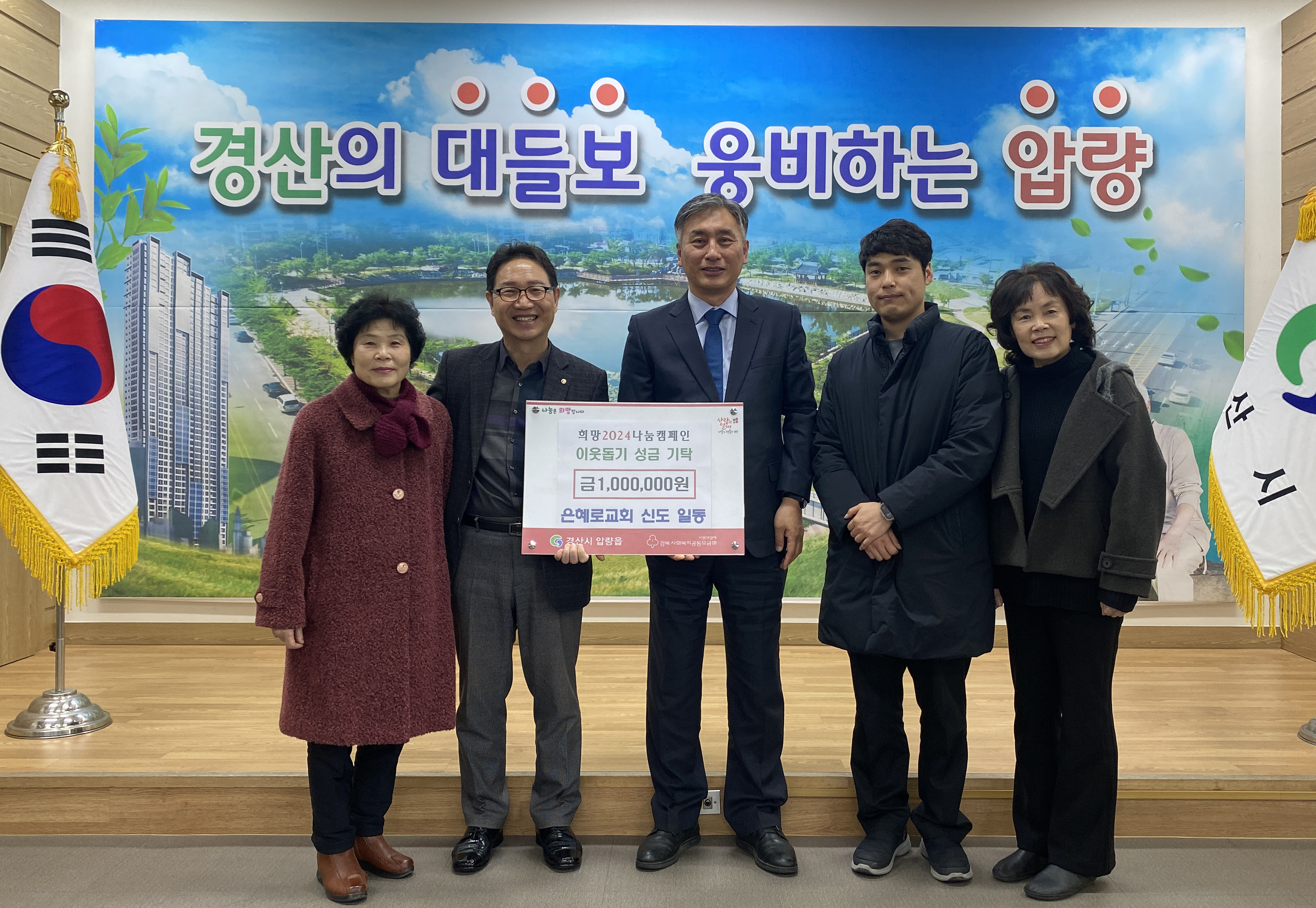 은혜로교회(담임목사 이창용)는 10일 압량읍 행정복지센터를 방문해 성도들이 성의껏 마련한 이웃돕기 성금 100만원을 기탁했다.