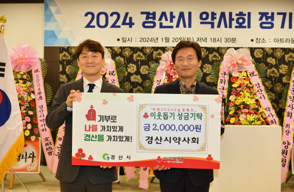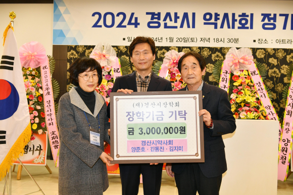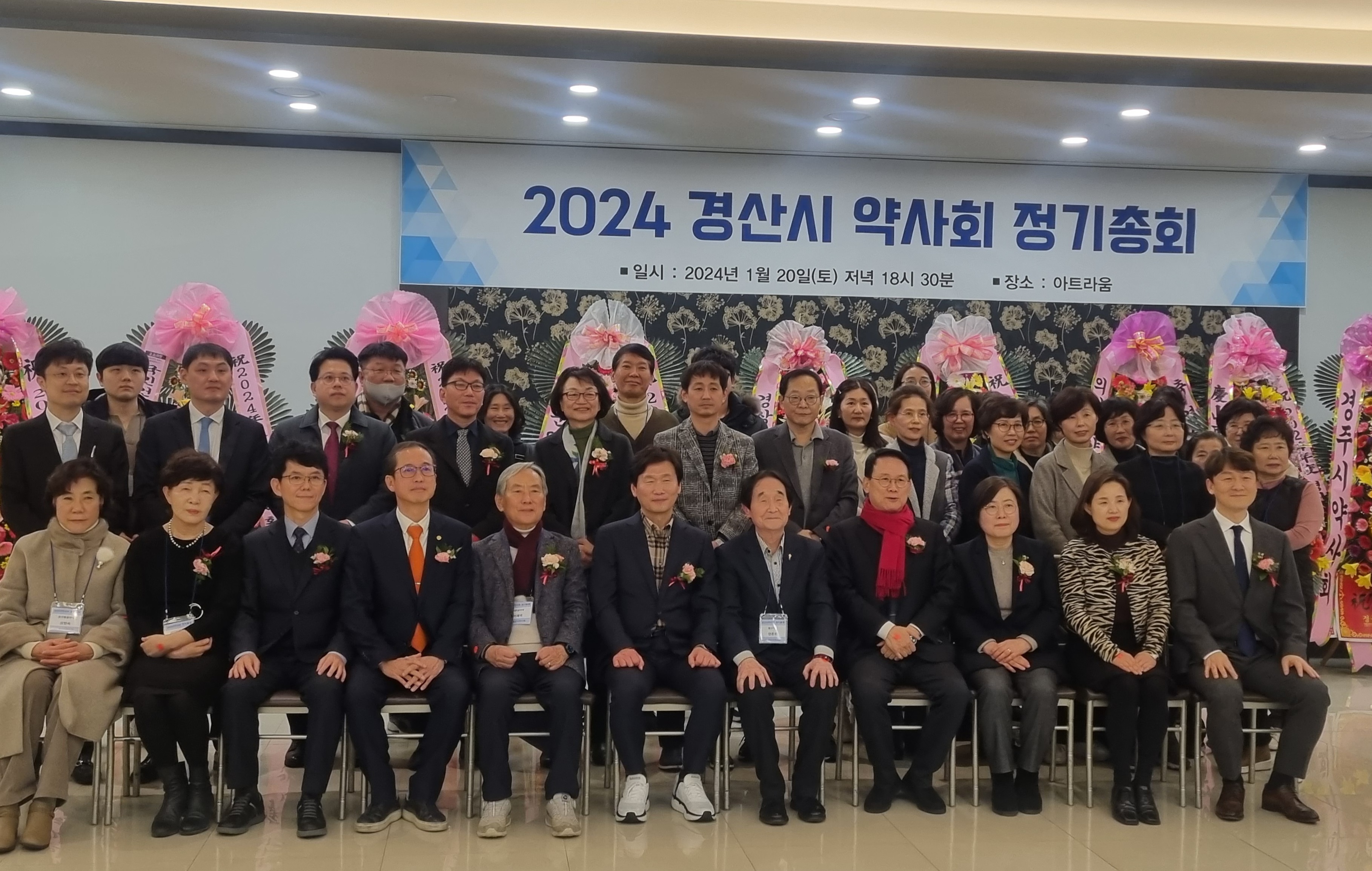 경산시약사회(회장 김진택)가 20일 경산 아트라움웨딩에서 「2024년 경산시약사회 정기총회」를 하고 이웃돕기 성금과 지역 인재 육성 발전 장학금을 기탁했다.