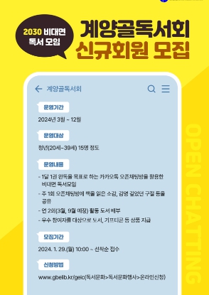 계양골독서회 참가희망자는 2월 16일까지 정보센터 누리집을 통해 신청할 수 있으며, 자세한 사항은 정보센터 종합자료실(053-810-9918)로 문의하면 된다.