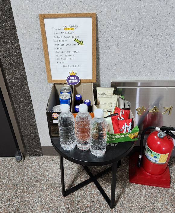 3년 전에 입주한 샤갈의 마을은 인터불고CC 옆에 위치한 경산지역의 대표적인 전원마을이다. 이 마을에 이사온 이호경(61세)씨는 택배기사들을 위해 복도에 미니편의점(사진)을 마련해 두었다. 캔커피, 생수, 하루견과류, 박카스 등이 전부인 작은 편의점이지만 이 마을에 배달온 택배기사들이 마음껏 골라 먹을 수 있도록 했다.