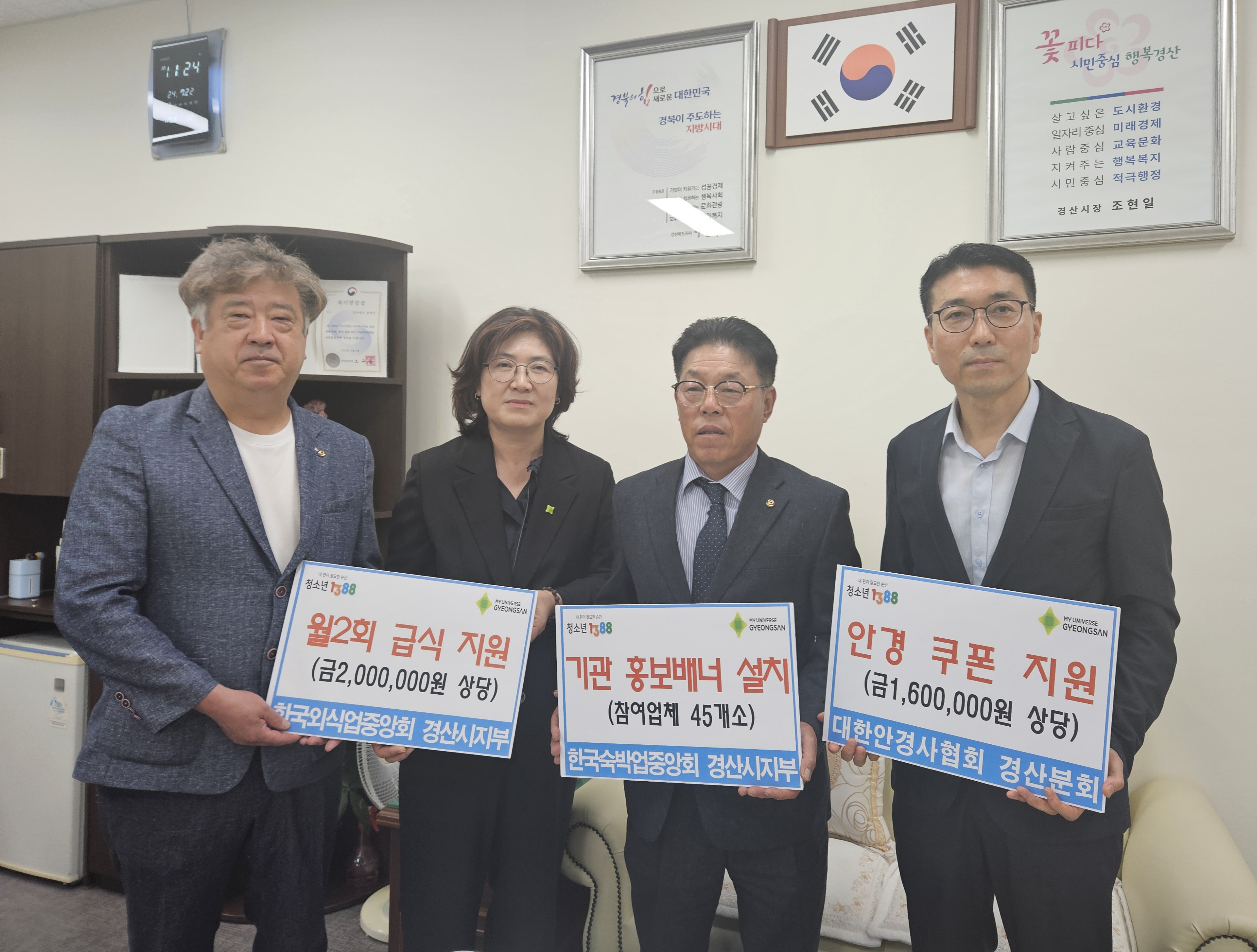 대한안경사협회 경북지부 경산분회(회장 박강원)는 시력 교정이 필요한 20명의 청소년들에게 안경 160만 원 상당을 지원하고, 한국외식업중앙회 경산시지부(지부장 김여욱)에서는 8월부터 12월까지 매월 2회씩 총 80여 명의 청소년들에게 관내 음식점을 통해 청소년이 희망하는 메뉴를 제공(200만원 상당)하기로 했다.
