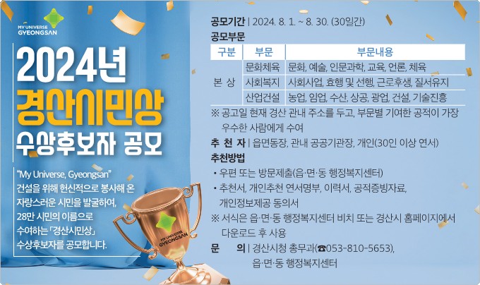 경산시가 2024년 경산시민상 수상 후보자를 오는 8월 30일까지 읍·면·동 행정복지센터를 통해 방문·우편 접수를 시작한다.