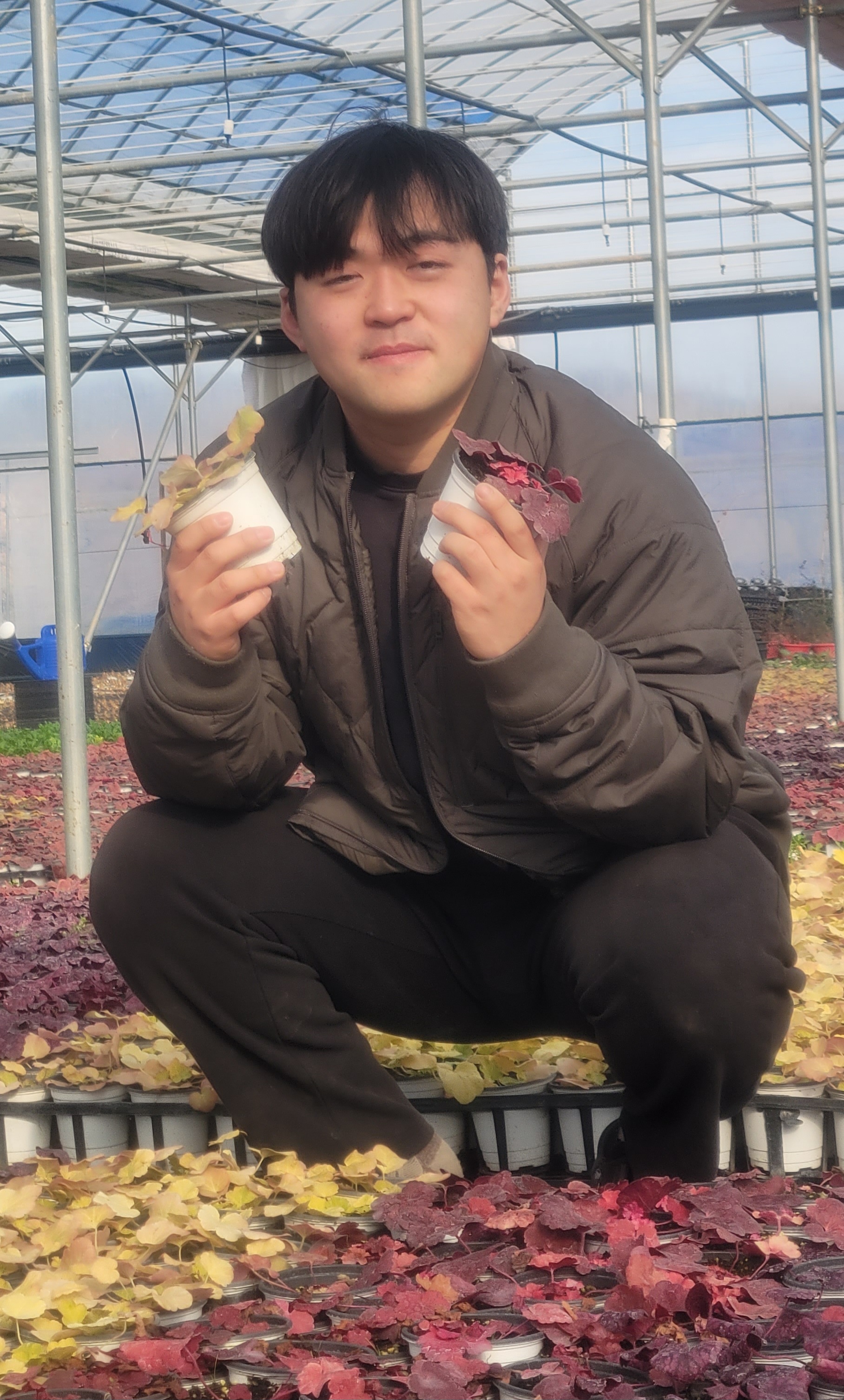 정 대표가 심혈을 기울이고 있는 작목은 아무래도 전공처럼 초화류 재배다. 이 가운데 정 대표는 후케라에 진심이다. 후케라는 미국에서 개량한 품종으로 사계절 꽃과 잎을 감상할 수 있는, 요샛말로 가장 핫한 품종이다. 종주국인 미국에서 개량해 중국에서 증식, 국내로 들여온다. 1센티 정도의 새끼묘를 용성화훼에서 10센티 크기 포트로 상품화해서 경매장에 출하하면 도매상을 거쳐 소매, 일반인들에게 건너갑니다. 새끼묘를 받아와서 한 겨울 비닐하우스에서 키워 세상에 내보내는데 약 4-5개월이 걸리는 셈이다.