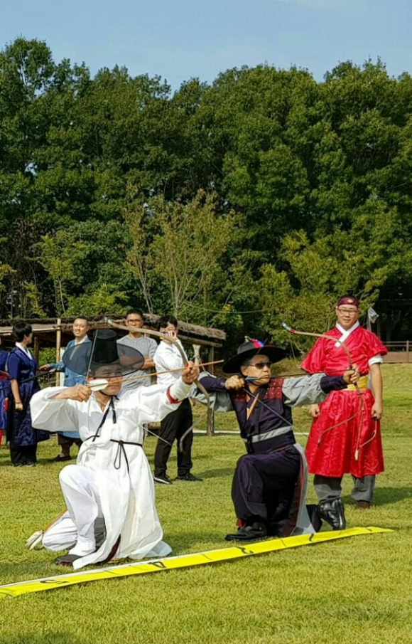 | ↑↑ 전통 활쏘기를 시연하고 있는 필자(두 번째가 무릎쏴 자세로 뒤돌아 쏘기) |