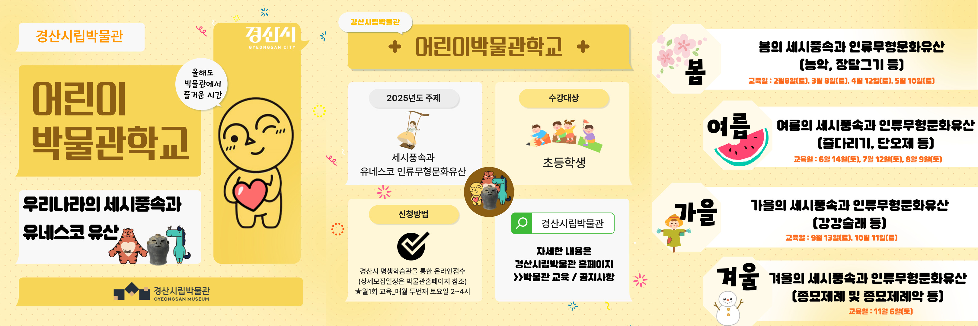 <어린이박물관학교>는 ‘우리나라의 세시풍속과 유네스코 인류무형문화유산’을 주제로, 계절별 전통 세시풍속과 유네스코 등재 유산을 학습하고 체험하는 방식으로 구성되었다.