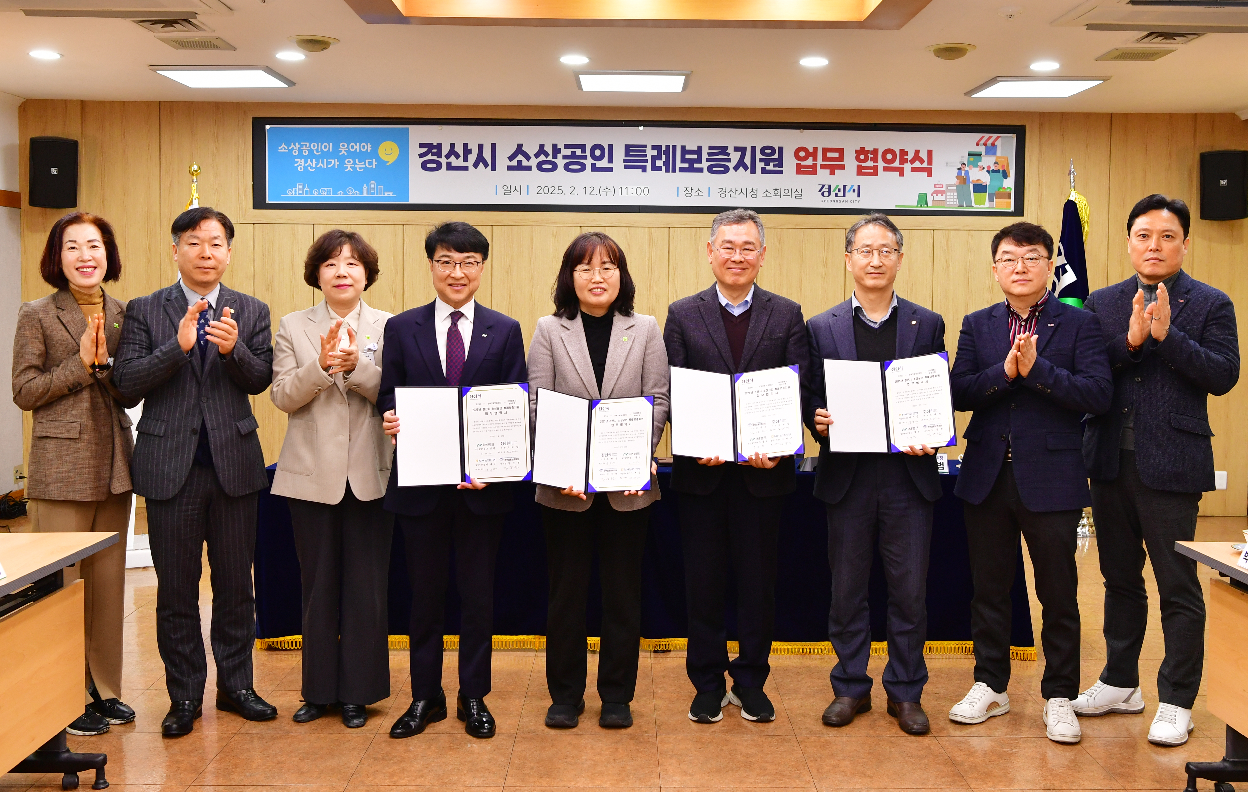 경산시(시장 조현일)와 경북신용보증재단(이사장 김중권), 아이엠뱅크(경산영업부장 조경현), 농협은행(경산시부지부장 오주범)이 2025년 경산시 소상공인 특례보증지원에 관한 업무 협약을 체결했다.