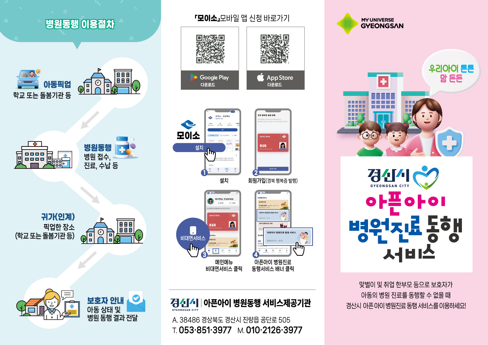 이용 대상은 4세 유아부터 초등학생까지며, 이용료는 무료다. 다만 병원비와 약값은 보호자 부담이며, 이용 시간은 평일 오전 9시 30분부터 오후 5시 30분까지 운영된다. 신청은 경상북도 모바일 앱 ‘모이소’를 통해 당일 오전 7시부터 오후 4시까지 가능하다. 서비스 이용과 관련한 문의는 햇살열매 사회적협동조합(☎851-3977) 또는 경산시 다문화가족팀(☎810-5329)에서 안내받을 수 있다.
