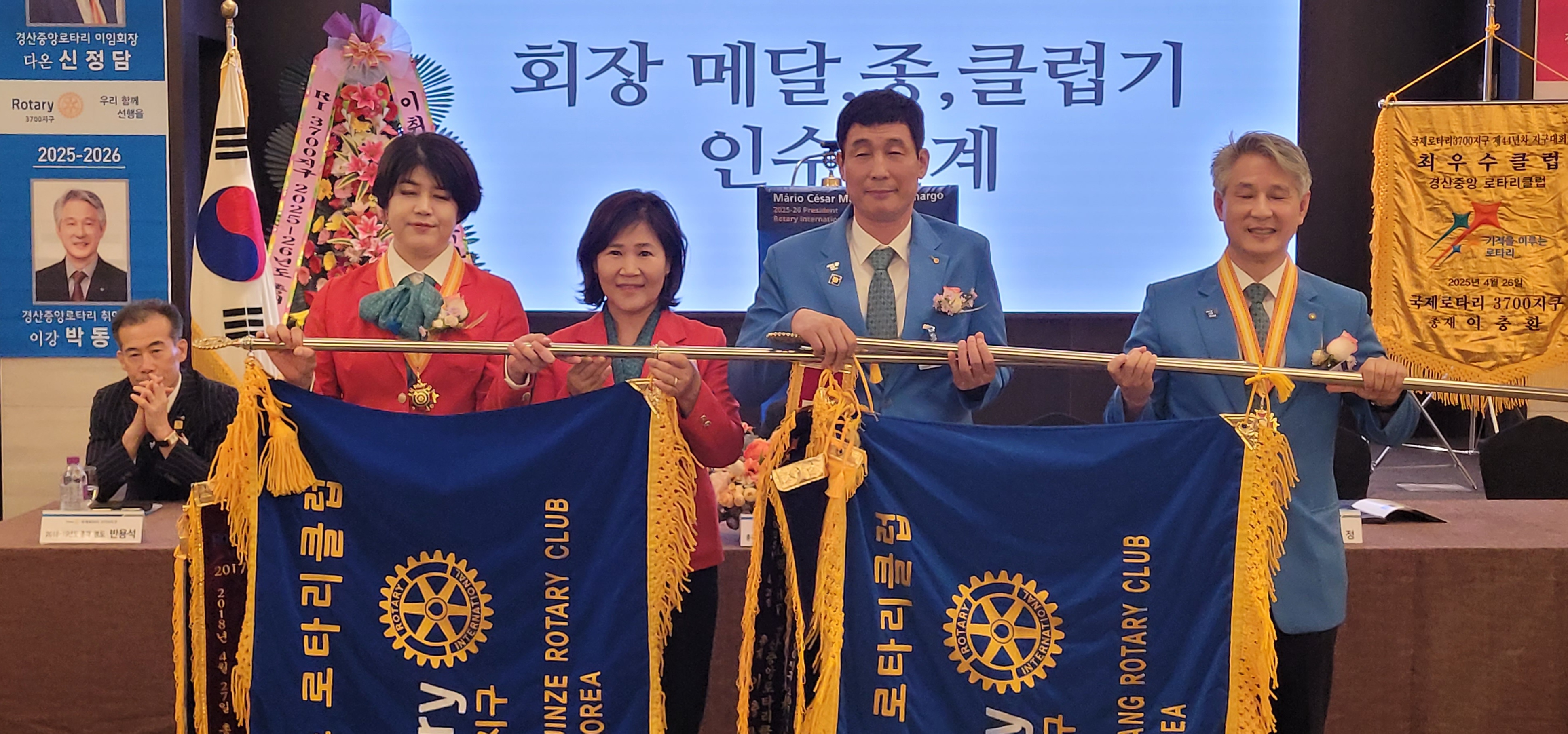중앙로타리는 이날 신정담 회장에 이어 박동근 회장이 취임했고 퀸즈는 박미경 회장에 이어 배순정 회장이 취임했다.