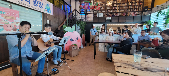 | ↑↑ 지난 6월 29일 서상동 소재 북카페 시가있는집에서 악기 연주로 경산카페축제 방문객들을 맞았다. |