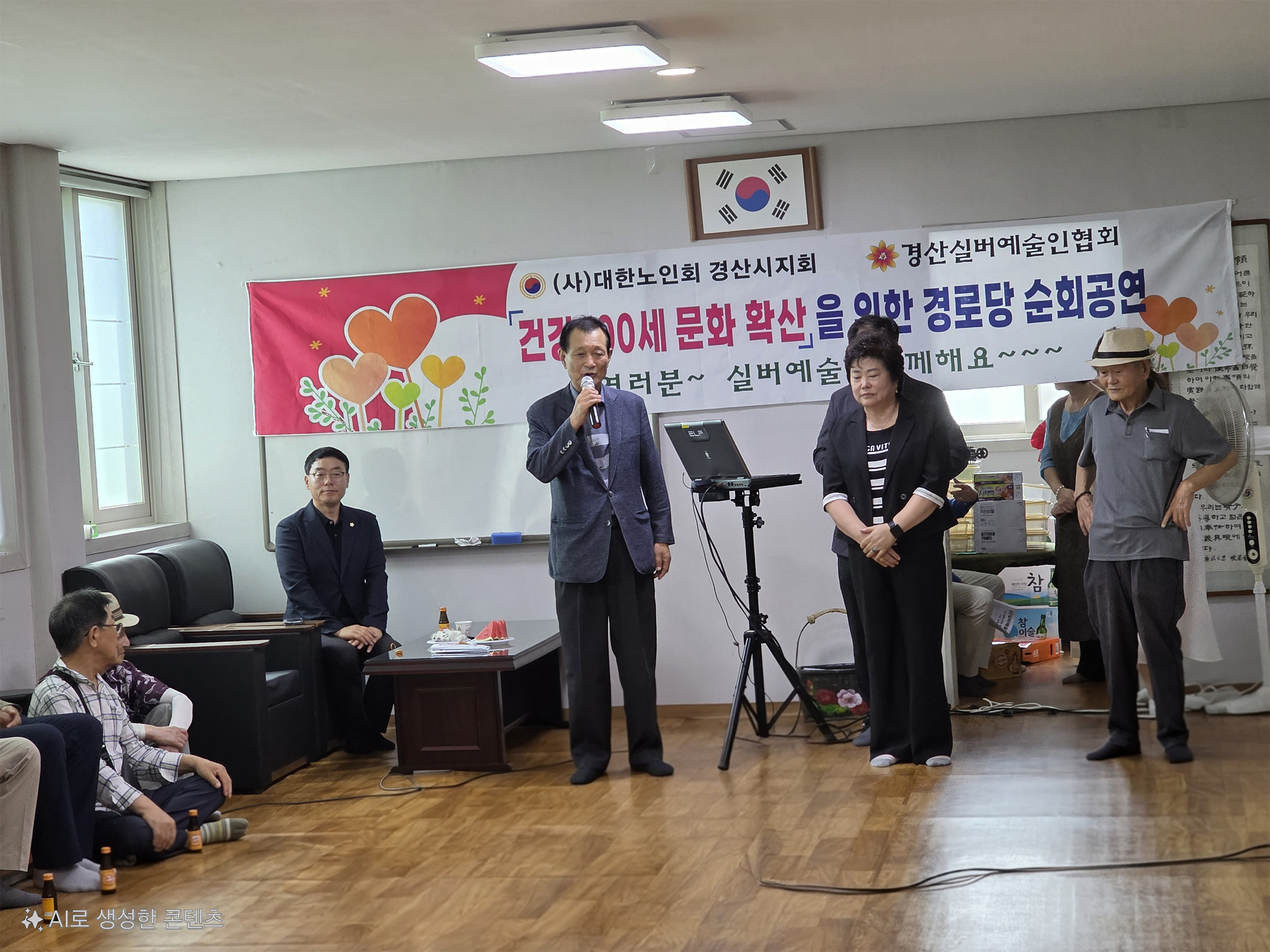 경산실버예술인협회가 대한노인회 경산지회 자인분회(회장 추영근) 강당에서 11차 건강 100세 문화확산을 위한 경로당 순회공연을 실시했다.