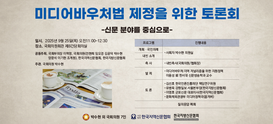 이학영 국회부의장, 전현희 더불어민주당 최고위원, 임오경 민주당 간사를 비롯한 국회 문화체육관광위원회 김윤덕, 박수현, 양문석, 이기헌, 조계원 등 국회의원 8명이 한국지역신문협회, 한국지방신문협회와 오는 9월 25일 오전11시 국회 의원회관 제8간담회의실에서 [미디어바우처법] 제정을 위한 토론회를 공동 개최한다.