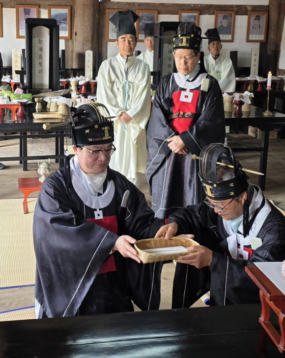 올해 경산향교 석전대제는 이도형 부시장(사진 오른쪽)이 초헌관 김종태 문화원장이 아헌관, 경산향교 강학회 이동화 회장이 맡아 진행됐다.